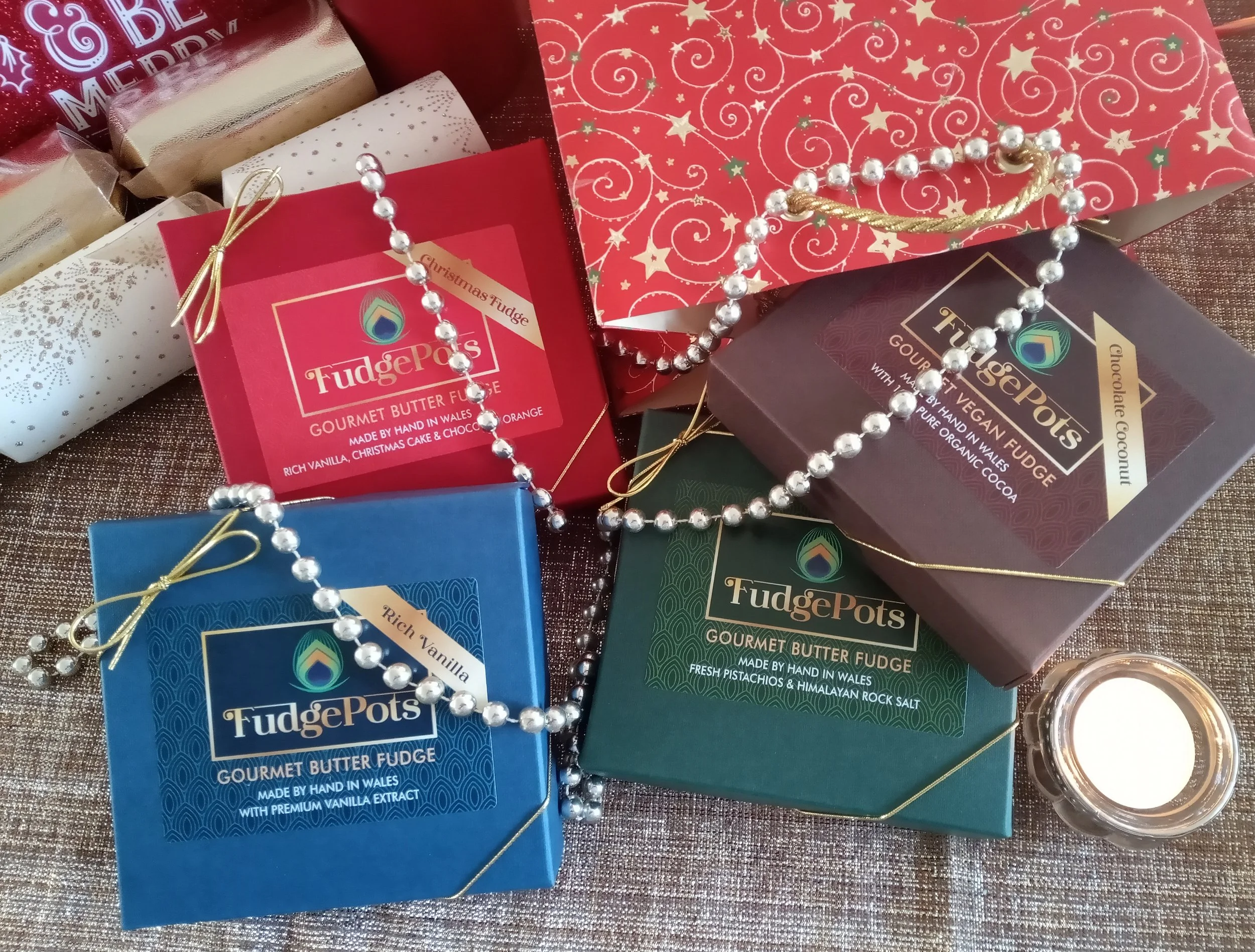 A Christmas gift for gourmets: handmade fudge in classic Rich Vanilla, toothsome Salted Pistachio, vegan Chocolate Coconut, or a Christmas Trio of three flavours in one box (Vanilla, Christmas Cake & Chocolate Orange). The fudge is handmade, delicious, with notes of cream and caramel, it is made of all-natural ingredients, and after it is eaten the box itself is an attractive holder for jewellery, cufflinks, or other small items. Large boxes contain 16 fudge pieces (minimum weight 230g) and Small boxes contain nine (minimum 115g).